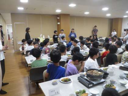 子どもたちが楽しみにしていた夕食タイム。メニューは「すき焼き」です。ご飯3杯お代わりしたという子どももいて大人気。たくさん食べて今からキャンプファイヤーに向かいます。
