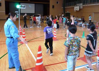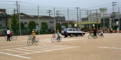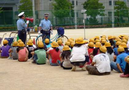 西淀川警察署の交通課の方に来ていただき、低学年は正しい歩行の仕方、高学年は安全な自転車の乗り方を教えていただきました。