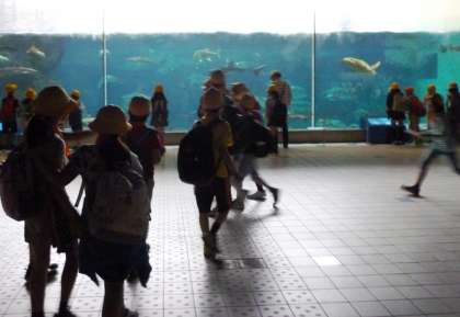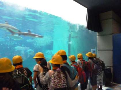 館内のグループ活動は、地図を片手にお目当ての館を見学していました。「水辺のふれあい遊園」では、サメにタッチしたり、ドクターフュッシュに手を掃除してもらったり、ハラハラドキドキの体験をしました。「ペンギン館」では、水の中を飛ぶように泳ぐペンギンの速さに興奮していました。「オオアナコンダ水槽」では、アナコンダを見上げる穴から見える大きさに驚いていました。