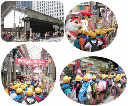 黒門市場の観光客の多さに驚きました。道具屋筋の食品サンプルやかき氷を作る機械に、目を見張る子ども達でした。
