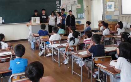 6年生は、今、10月の修学旅行に向けて、平和学習に取り組んでいます。修学旅行での慰霊祭でささげる千羽鶴を作成する一方、他の学年にも平和への思いをよびかける目的で、朝の時間にグループに分かれて全クラスで平和紙芝居をしました。