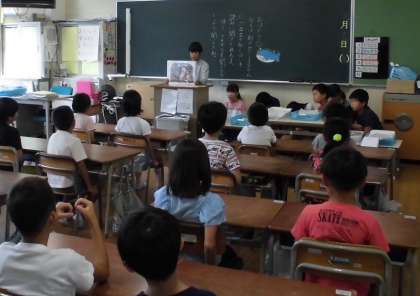 「原爆の子の像」にまつわる「佐々木貞子さん」のお話をもとにした紙芝居で、1年生から5年生まで、どのクラスの児童も真剣に聞いていました。