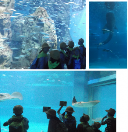 ちょうど太平洋水槽では、ジンベエザメのエサやりの時間で、周りにいる魚たちも動き回っていて、子どもたちも大喜びでした。