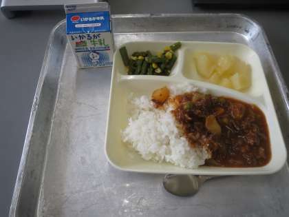 今日の献立 ハヤシライス グリーンアスパラとコーンのサラダ 洋ナシ 牛乳