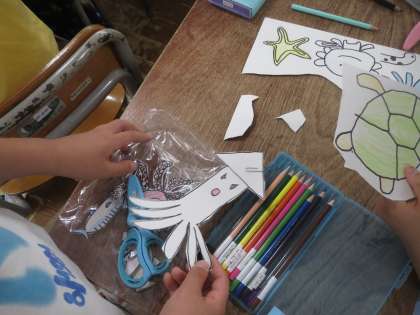 海の中のいろいろな生き物を描き、その形に切ってクリップを付ける。