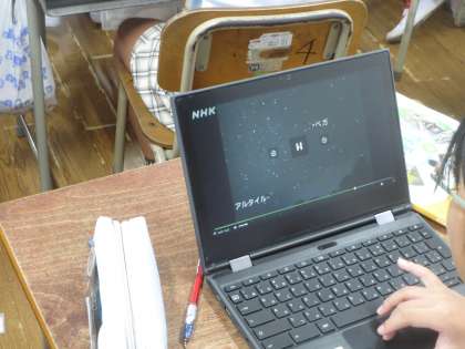どの方向にどんな星、星座が見えるのか「星座盤」を使って確認しました。さらに動画で確認するために子どもたちはタブレットを机上に準備します。
