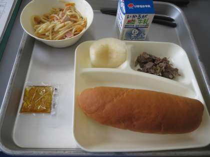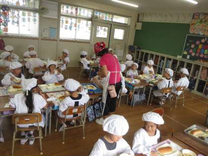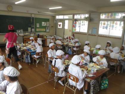 今日は1年1組の教室で一緒に食べました。1学期よりも食べるスピードが速くなっています。おかわりもして食管は空になりました。