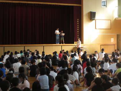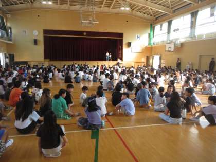縦割り班に分かれてクイズを考えます。教職員が舞台袖から声を変えて子どもたちに話しかけます。いつも聞きなれない声のトーンで話をしますがすぐに「〇〇先生や」と即答。子どもたちはよく聞いています。全問正解したグループが多くあってビックリでした。