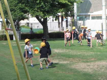 本校自慢の芝生にある遊具を使って楽しそうに遊んでいる子どもたち。体いっぱい楽しんでいます。見ている私も楽しくなってきます。