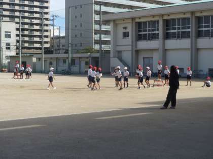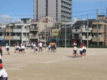 チームで協力し学習に取り組んでいます。ゲーム形式での学習だったため、コートの中で「パス、パス」「走ってー」などコミュニケーションをとりながら進めます。