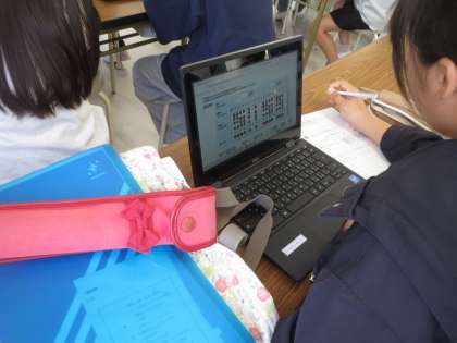「雨のうた」にでてくる和音を使って旋律をつくっていきます。タブレットを使って音をはめ込み曲にしていきます。音のイメージを大切にしながら学びを深めていきます。