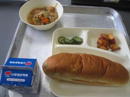 今日の献立 おさつパン 中華煮 大学いも あっさりきゅうり 牛乳