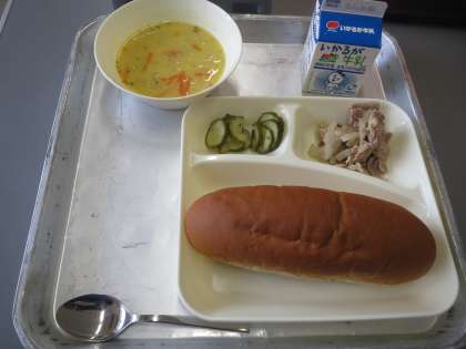 今日の献立 黒糖パン 豚肉のガーリック焼き コーンスープ きゅうりのバジル風味サラダ 牛乳