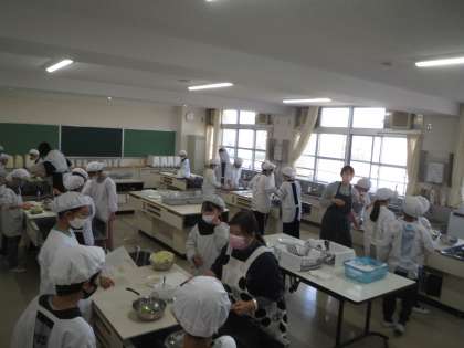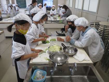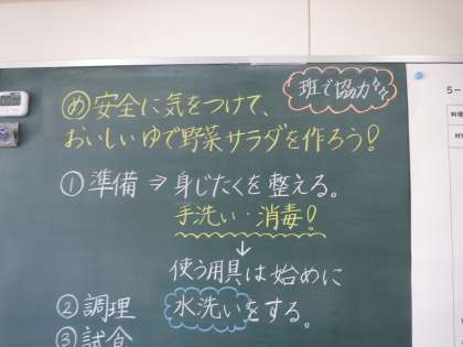 調理実習です。ニンジンやブロッコリーなどの野菜を食べやすい大きさに切り、湯がきます。その間に、ドレッシング担当は調味料の分量を調整しながら作っていきます。できあ上りが楽しみです。