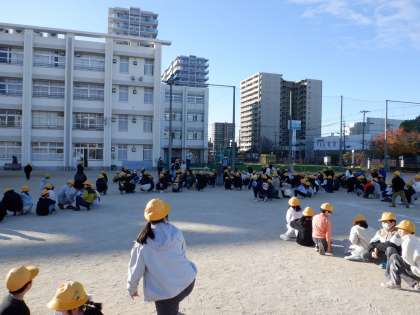 たてわり班に分かれてじゃんけん列車をしました。じゃんけんをして負けた人は勝った人の後ろに立ち、肩をもってつながります。じゃんけんのたびに列は長く、大きくなっていきます。いくつもの長い列車が出来上がりました。