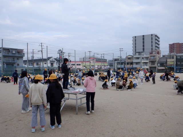 今日は集会委員会による児童集会です。各グループで協力しでゲームを行います。今日のゲームは「文字探し」です。運動場のいたるところに張られた文字を一文字ずつ組み合わせてひとつの言葉にします。今回のお題は3つの言葉。運動場を歩き回って文字を見つけていきます。校舎の壁や遊具に張られたものや教職員の背中に張られたものをみつけて言葉にします。今日の正解は「バレンタイン」「せつぶん」「ゆきだるま」でした。2月らしいお題でした。すべて見つけられた班も多くありました。次回も楽しみです。