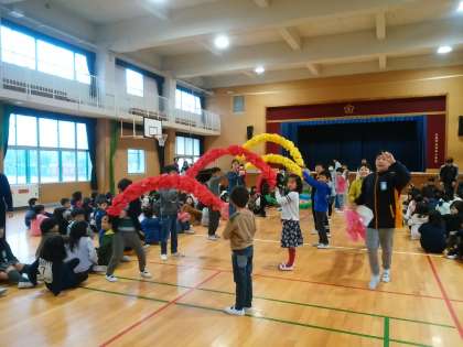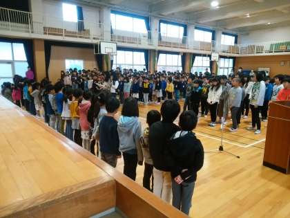 6年生代表のあいさつの後、全員で神津小学校歌を歌いました。