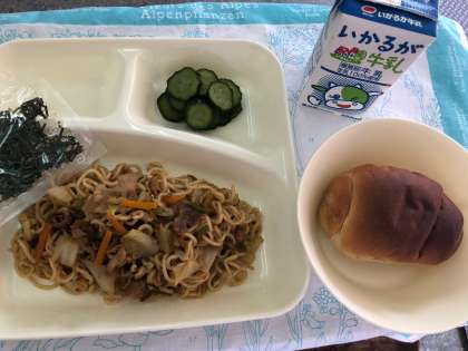 「焼きそば」は児童に人気の定番メニューです。豚肉を主材にソース等で味付けしています。1人1袋、きざみのりをかけていただきます。