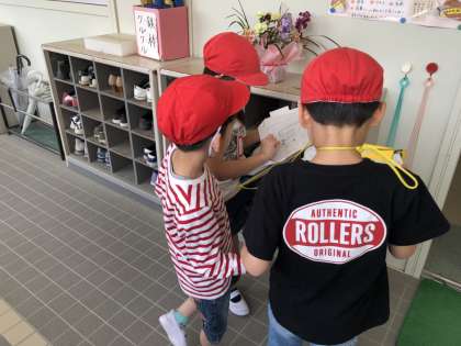 今日は1・2年生が学校たんけんを行いました。2年生が地図を見ながら、1年生に優しく案内しています。