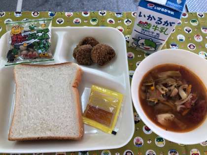 「ミネストローネ」は、イタリア語で「具だくさん」という意味をもつ野菜のスープです。今日の給食では、鶏肉とキャベツ、たまねぎ、トマトなどの野菜が使われています。