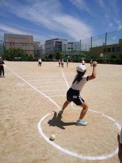 今週はスポーツテスト週間です。きょうは3年生が慣れないソフトボール投げに挑戦しました。