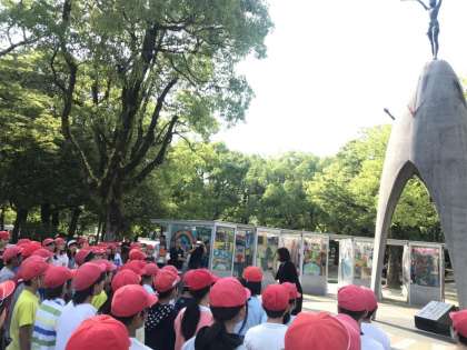 原爆の子の像の前で慰霊祭を行いました。みんなで折った折り鶴をあいさつと共に捧げました。HEIWAの鐘も心をこめて歌いました。