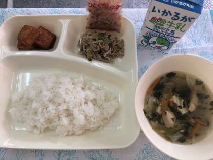 今日の給食は、夏野菜の王様と言われるにがうり(ごーや)を使った、「ゴーヤチャンプルー」です。「チャンプルー」とは沖縄県の方言で「ごちゃまぜ」という意味で、いろいろな食材をいためた料理です。