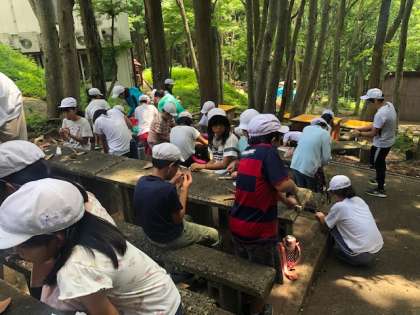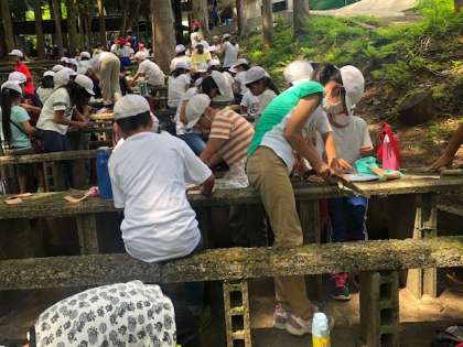 のこぎりやヤスリを使って、木のキーホルダーを作っています。