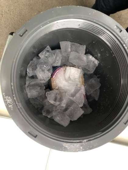 生クリーム、砂糖、バニラエッセンスを入れた缶の周りに氷と塩を入れてよく冷やします。