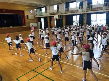 約130名で動きをそろえた演技ができるように頑張って練習しています。