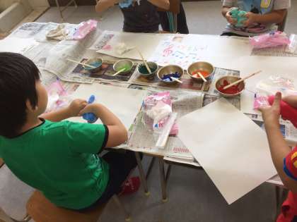 絵の具を紙粘土に混ぜ込み、低学年は「がくしゅうはっぴょうかい」という文字、高学年は音符などの記号を作りました。