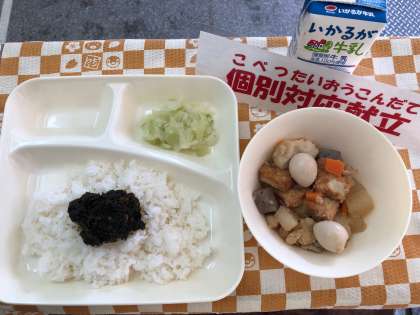 「関東煮」は、鶏肉、うずら卵、新食品のまる天を主材に、じゃがいも、こんにゃく、あつあげ、だいこん、にんじんを使用し、砂糖、みりん、塩、うすくちしょうゆ、こいくちしょうゆで味付けし、煮含めています。「うずら卵の個別対応献立」となっています。