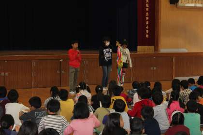 この日の全校朝会では、6年生が、10月29日(水)に修学旅行に行くことを全校のみんなに伝えました。