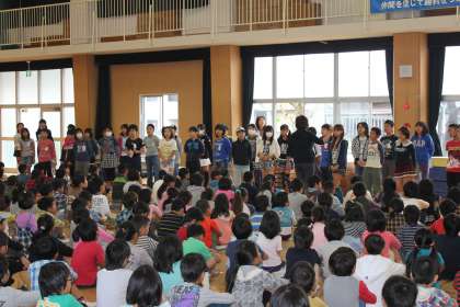 千羽鶴の紹介の後、平和記念公園で「鶴を捧げる式」のときに歌う「折り鶴」の歌も披露しました。