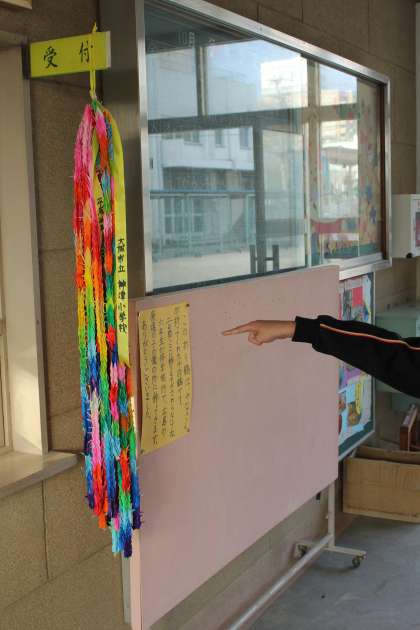 そして、たてわり集会で全員で折った鶴が千羽になったので、それを束ねた「千羽鶴」を紹介し、お礼を言いました。