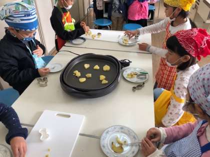 2年生は生活科の学習でおいもパーティーをしました。ふかしたさつまいもを型抜きで好きな形にして、焼きました。