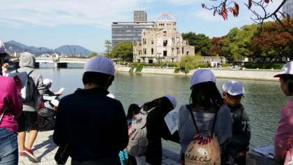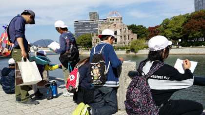 写真は、元安川沿いから、原爆ドームをスケッチしている様子です。