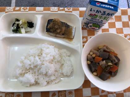 「五目豆」は、大豆煮の他に、こんにゃく、にんじん、れんこん、ごぼう、切りこんぶを使用し、砂糖、みりん、塩、うすくちしょうゆ、こいくちしょうゆで味つけした、かみごたえのある献立です。