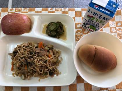 「オイスターソース焼きそば」は、めん献立のバリエーションを増やすために出来た献立です。豚肉を主材にオイスターソース、テンメンジャンなどを味付けに使用しています。