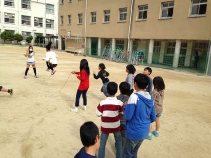 写真は、フラフープくぐりや大なわを練習しているところです。