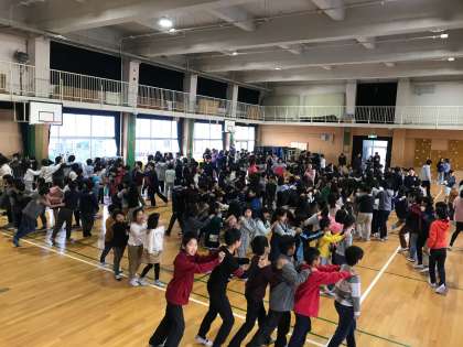 今週の児童集会では「じゃんけん列車」をしました。色々な学年の児童が混ざって最長記録は95人でした!