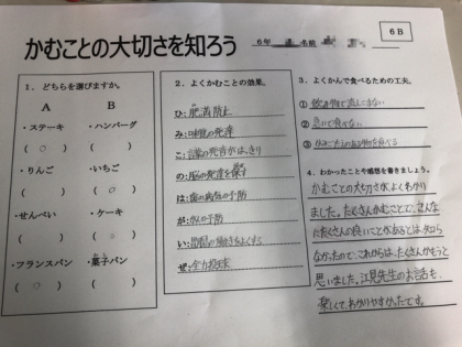 食生活を振り返り、噛むことの大切さを知り、噛み応えのある食べ物を知り、和食は噛み応えの多い物を使っていることを学びました。