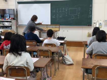 大阪市珠算協会の先生に来ていただき、3年生のそろばん出前授業です。