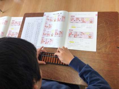 先生の大きなそろばんに合わせて、パチパチと珠(たま)を動かします。