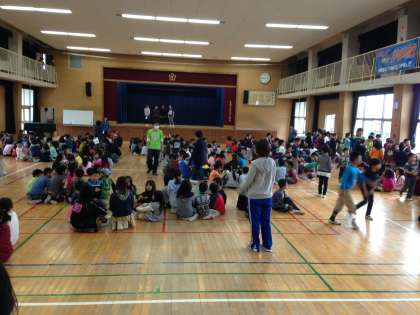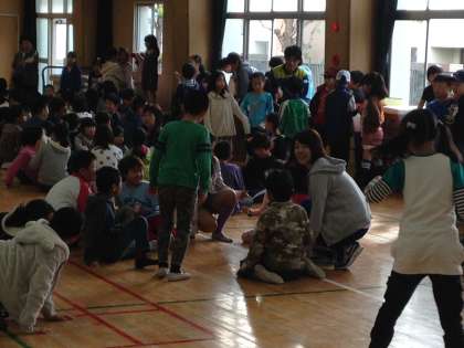 集会委員の子どもが言った、「〇人!(で集まれ!)」の合図で友達を探し、その人数で集まって座るゲームをしました。