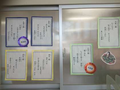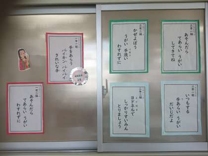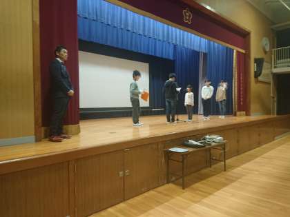 2月3日〜7日は健康標語週間でした。健康についての標語を考え、クラスで一つだけ良い作品を健康委員会に提出してもらいました。その中から「健康委員会賞」「教頭賞」「校長賞」を選び、集会で表彰をしました。健康委員会賞に選ばれたのは、1年1組「手をあらう バイキン バイバイ きれいな手」でした。教頭賞に選ばれたのは、5年2組「三食の ごはんをしっかり 食べて寝て すいみんしっかり パワフルボディ」でした。校長賞に選ばれたのは、6年2組「朝ごはん しっかり食べて 學校へ 外であそんで 体力づくり」でした。他のクラスの作品も良かったです。保健室前に掲示しているので、学校にお立ち寄りの際は、ぜひご覧下さい。
