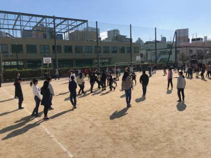 学年ごとに分かれ、ドッジボール、大縄跳び、鬼ごっこの遊びをしています。とても楽しそうです。