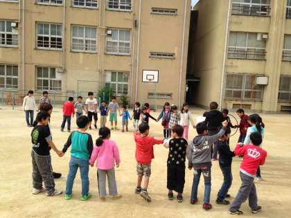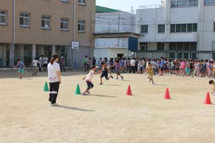 1〜6年生混合のたてわり班で、いろいろな競技をします。主たる目的は、異学年で楽しく体を動かしながら交流する中で、仲間意識を育てたり、児童会で主体的に計画・運営し、自主性を育てたりすることです。