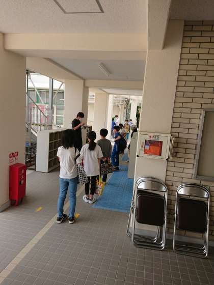 今日は、2年生から6年生までの登校日でした。クラスごとに8時半と11時に集合し、そして、それぞれを二つに分け、3密にならないように配慮をしました。まず、正門を入ったエントランスで、体温を計ってきているか確認しました。その後、それぞれの学年ごとに集まりました。ここでも密にならないように広く間隔を取って揃うのを待ちます。今日は、とても暑く、日陰に入って待ちました。