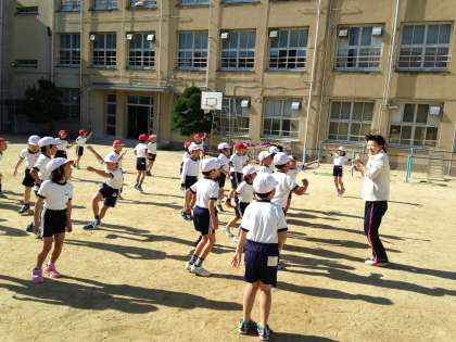 なわとび運動の後、みんなで跳びはねながら、「6+3=9」「6−3=3!」と、たし算やひき算をしていました。
